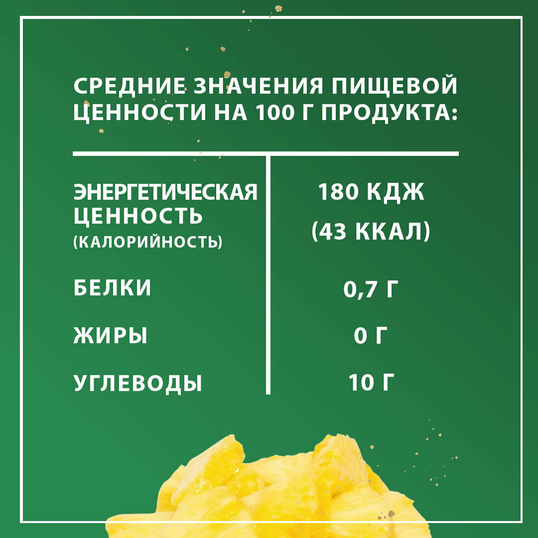 | Состав | ананас, сок ананаса прямого отжима, регулятор кислотности: лимонная кислота. Содержит сахара природного происхождения. |