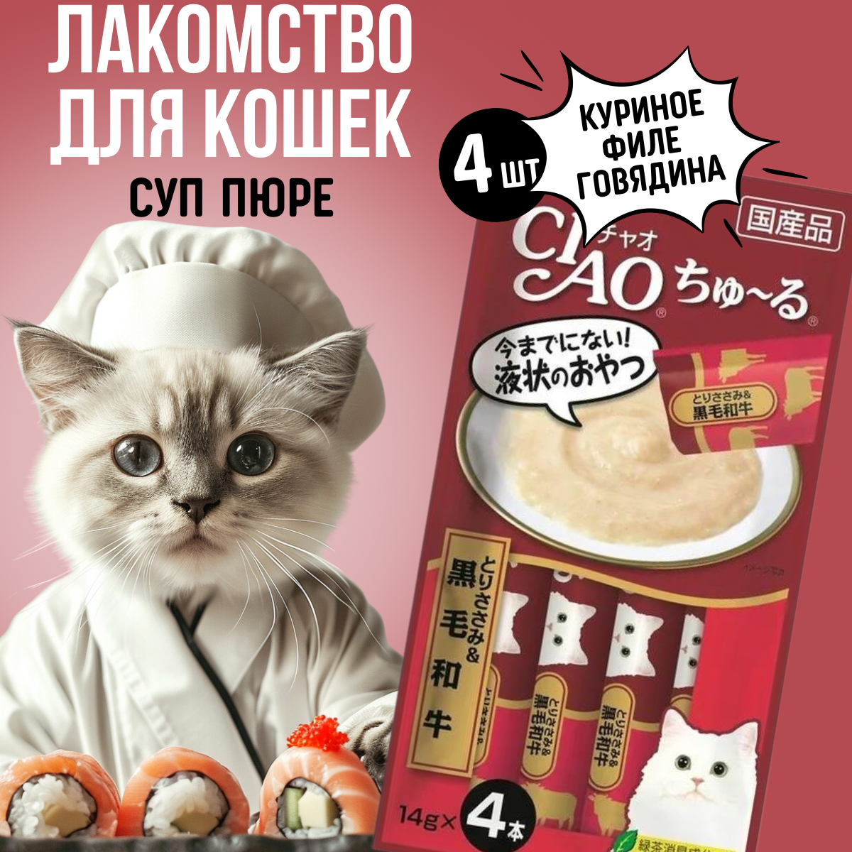 Лакомство для кошек INABA CIAO Churu пюре из куриного филе и говядины (14г х 4шт) интересное:
