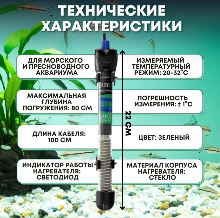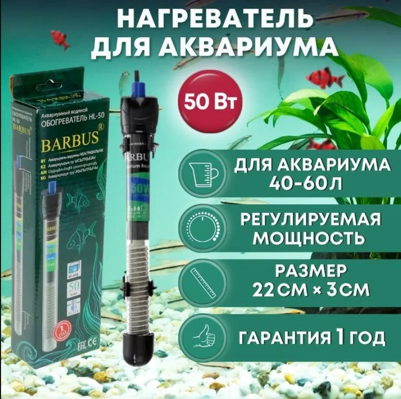 СохранитьОбогреватель терморегулятор стекло 50ватт, для аквариума 40-60л, 100см электрошнур (Барбус) heater 002 интересное: