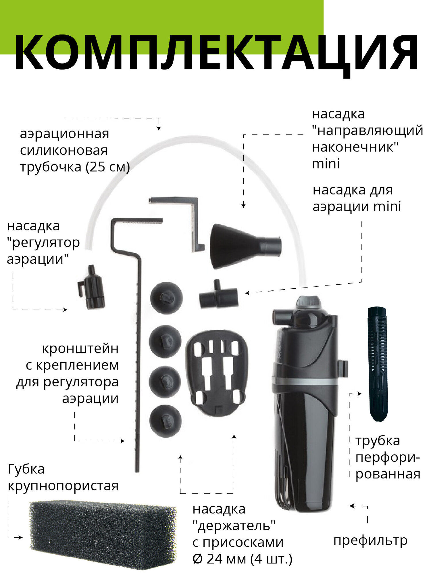 | Подробная комплектация | 1. Губка крупнопористая, 2. Комплект насадок для фильтра: - аэрационная силиконовая трубочка (25 см), - кронштейн с креплением для регулятора аэрации, - насадка "держатель" с присосками Ø 24 мм (4 шт.), - насадка "направляющий наконечник" mini, - насадка "регулятор аэрации", - насадка для аэрации mini, - стакан с префильтром, - трубка перфорированная. 3. Инструкция с гарантийным талоном. |