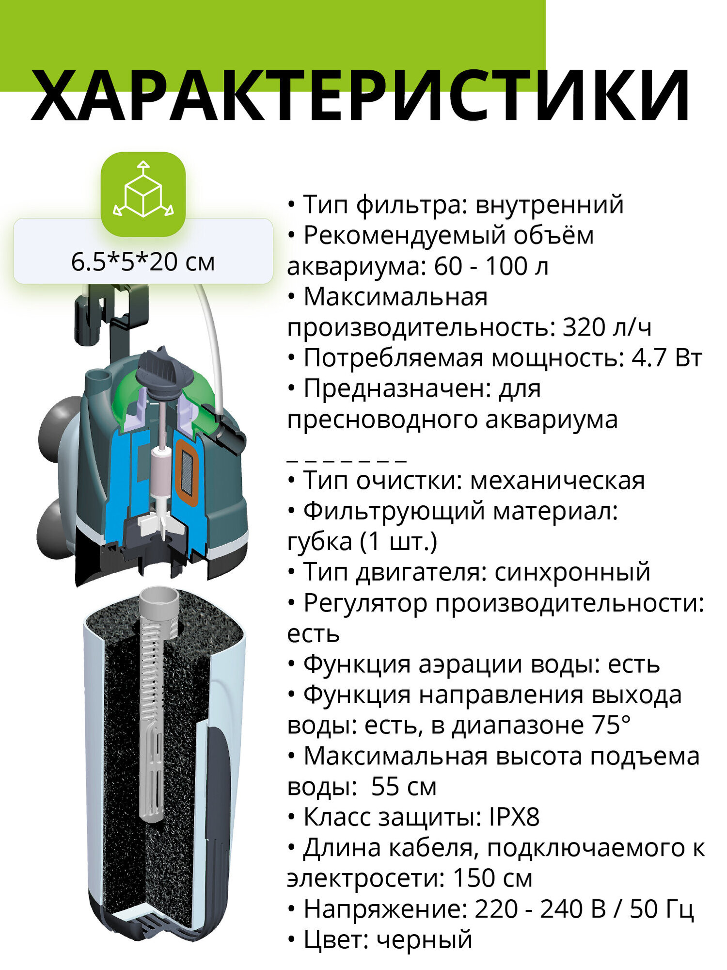 | Дополнительная информация | Конструкция фильтра предусматривает возможность регулировать силу потока воды на выходе из фильтра, что важно для некоторых видов рыб. Направление движения воды можно регулировать в диапазоне 75°. |