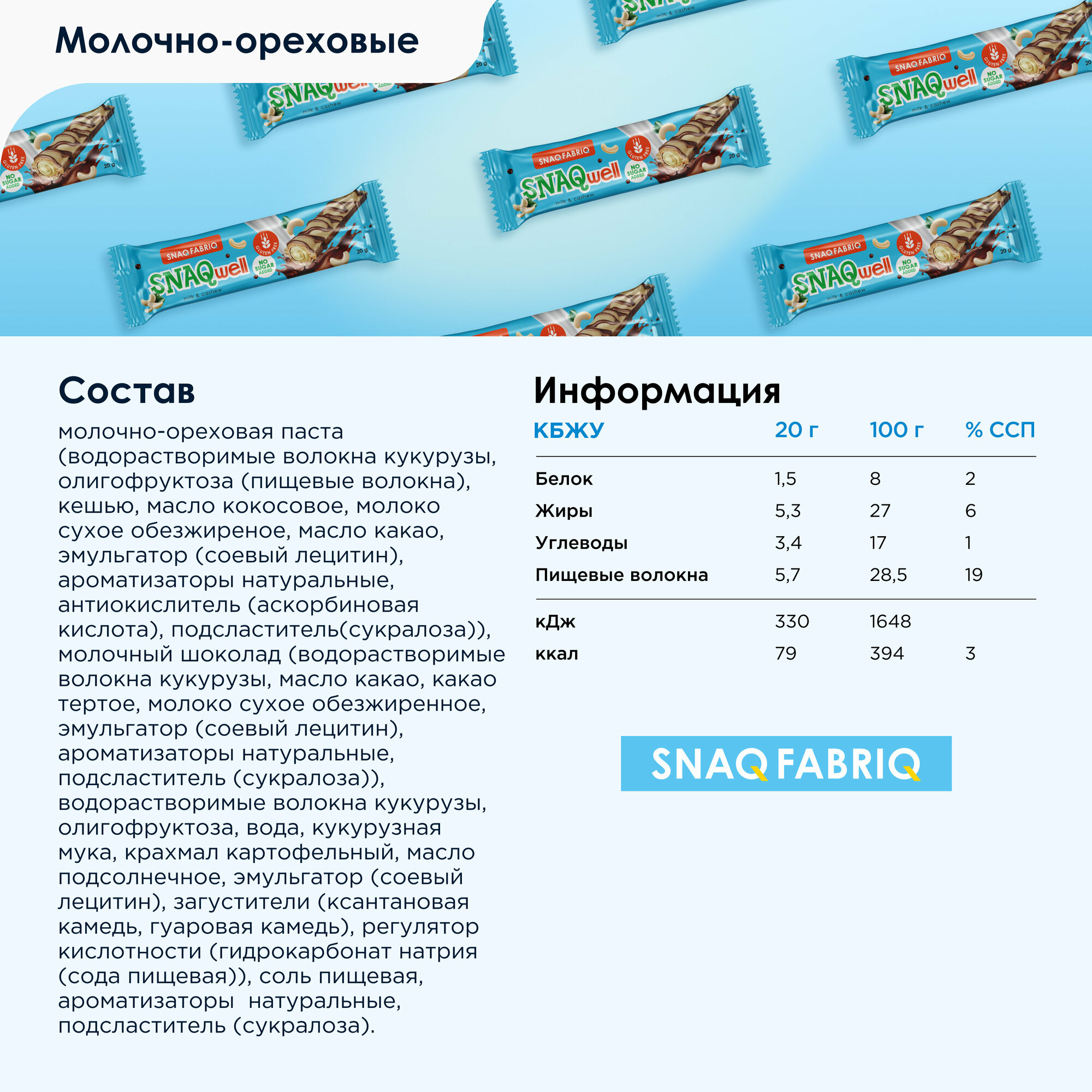 | Состав | Шоколадно-ореховая паста (Водорастворимые волокна кукурузы, олигофруктоза (пищевые волокна), фундук, кокосовое масло, сухое обезжиренное молоко, какао порошок натуральный, эмульгатор (соевый лецитин), ароматизаторы натуральные, антиокислитель (аскорбиновая кислота), подсластитель(сукралоза)), молочный шоколад (водорастворимые волокна кукурузы, какао масло, какао тертое, молоко сухое обезжиренное, эмульгатор (соевый лецитин), ароматизаторы натуральные, подсластитель (сукралоза)), водорастворимые волокна кукурузы, олигофруктоза, вода, кукурузная мука, крахмал картофельный, подсолнечное масло, эмульгатор (соевый лецитин), загустители (ксантановая камедь, гуаровая камедь), регулятор кислотности (гидрокарбонат натрия (сода пищевая)), соль пищевая, ароматизаторы натуральные, подсластитель (сукралоза). |