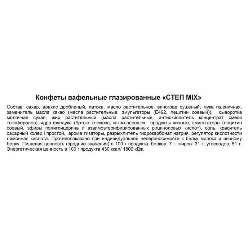 | Состав | сахар, арахис дробленый, патока, масло растительное, виноград сушеный, мука пшеничная, заменитель масла какао (масла растительные, эмульгаторы (Е492, лецитин соевый)), сыворотка молочная сухая, жир растительный (масла растительные, антиокислитель концентрат смеси токоферолов), ядра фундука тёртые, глюкоза, какао-порошок, продукты яичные, эмульгаторы (лецитин соевый, эфиры полиглицерина и взаимоэтерифицированных рициноловых кислот), соль, краситель сахарный колер l простой, ароматизаторы, разрыхлитель гидрокарбонат натрия, регулятор кислотности лимонная кислота |