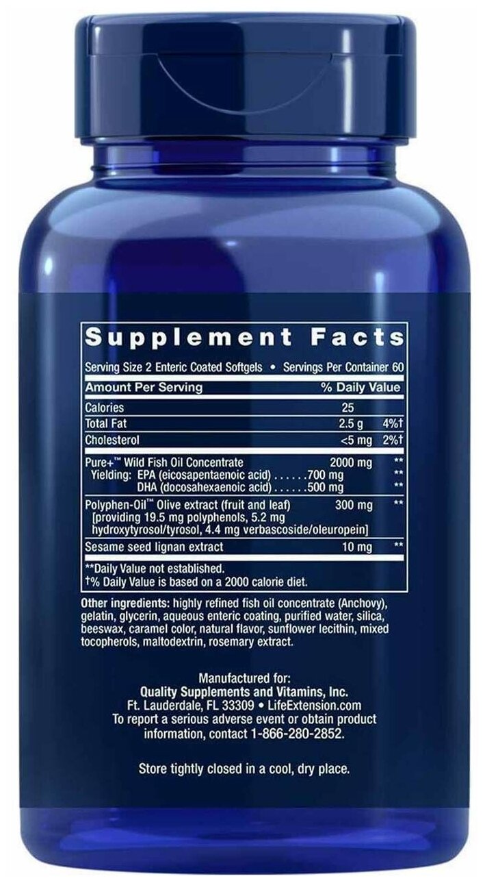| Состав | размер порции: 4 капсулы; количество в 1 порции: концентрат рыбьего жира Pure+ (из рыбы, выловленной в природной среде) - 2000 мг (содержит: ЭПК (эйкозапентаеновую кислоту) - 700 мг, ДГК (докозагексаеновую кислоту - 500 мг), экстракт оливы (плоды и листья) Polyphen Oil (содержит 19,5 мг полифенолов, 5,2 мг гидрокситирозола/тирозола, 4,4 мг вербаскозида/олеуропеина) - 300 мг, экстракт лигнана семян кунжута (Sesamum indicum) - 10 мг, концентрат рыбьего жира с высокой степенью рафинирования (анчоус), желатин, глицерин, очищенная вода, диоксид кремния, натуральный ароматизатор, подсолнечный лецитин, карамельный краситель, смешанные токоферолы, экстракт розмарина, мальтодекстрин |