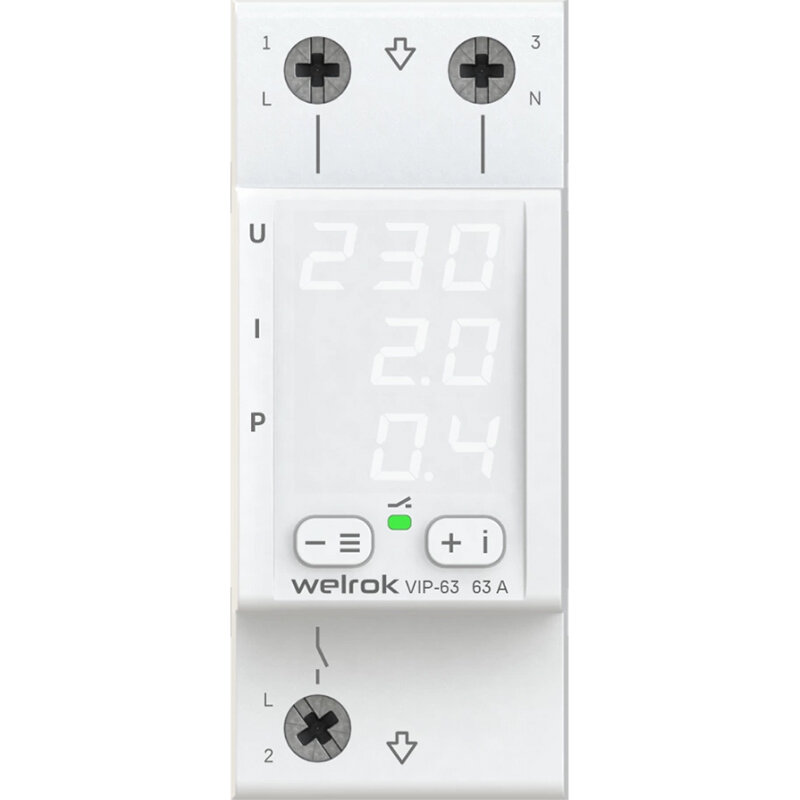 Реле напряжения с контролем тока и мощности Welrok VIP-63 белый индикатор