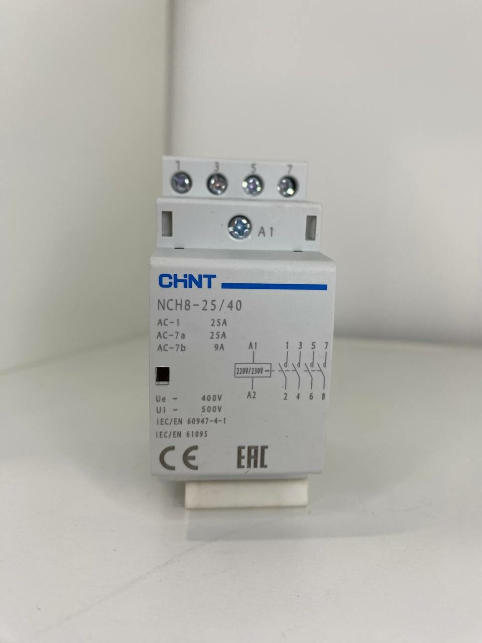 Контактор модульный CHINT NCH8-25/40, 25 Ампер, 400 Вольт, нормально разомкнутый (4NO), четырех полюсный, катушка 220 вольт, пускатель магнитный.
