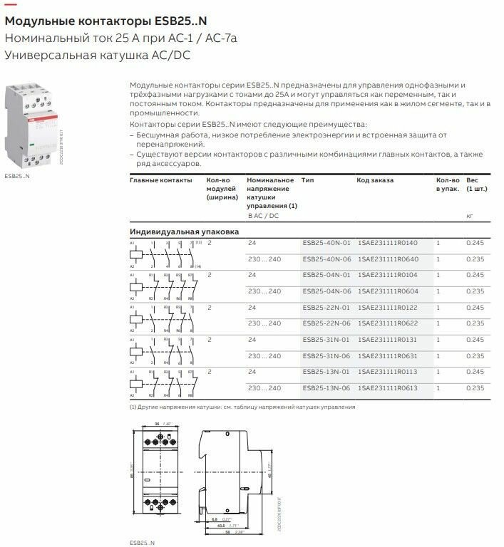 СохранитьКонтактор ABB ESB25-40N-01, модульный, 25А, АС-1, 4НО, катушка, 24В, AC/DC 1SAE231111R0140 интересное: