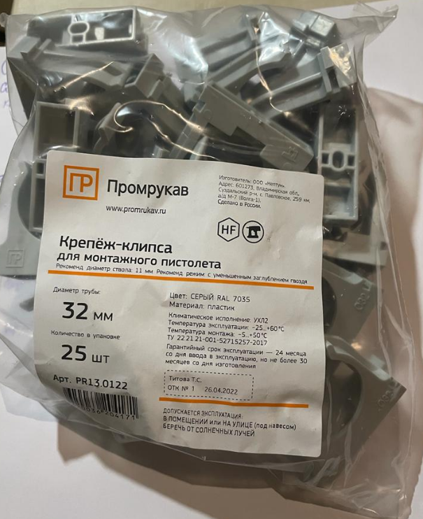 СохранитьКрепеж-клипса для труб для монтажного пистолета серая в п/э д32 (25шт/500шт уп/кор) Промрукав интересное: