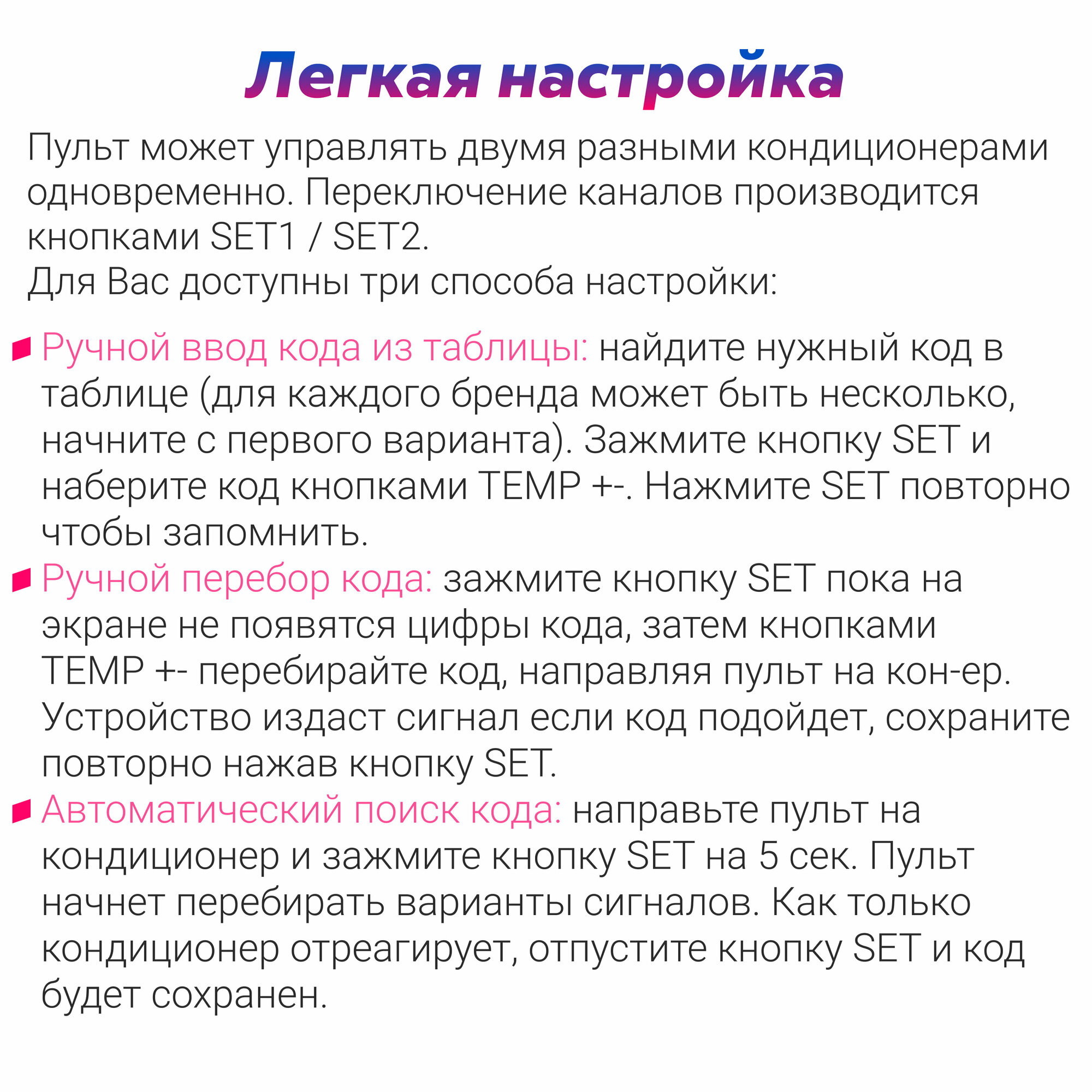 Ниже Вы можете прочитать отзывы на Универсальный пульт для всех кондиционеров, с фонариком, можно настроить на 2 устройства одновременно, ознакомится с подробными характеристиками, посмотреть интересные обзоры и фотографии на Универсальный пульт для всех кондиционеров, с фонариком, можно настроить на 2 устройства одновременно.