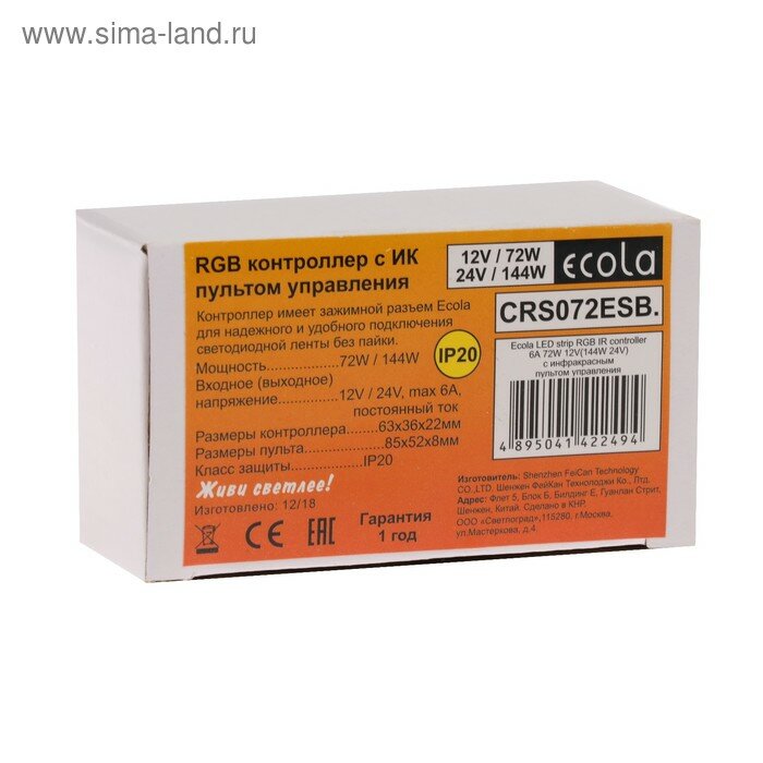 Ecola LED strip RGB IR контроллер 6A 72W 12V (144W 24V) с инфракрасным пультом управления CRS072ESB интересное: