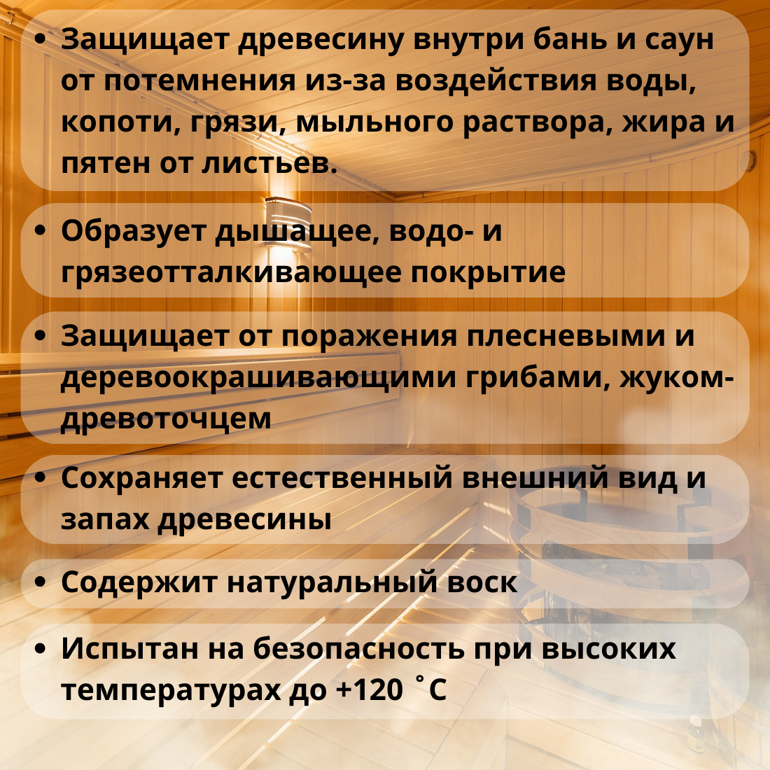 | Особенности | быстросохнущая, водозащитная, декоративная, для использования в бане/сауне, невымываемая, с антисептиком |
