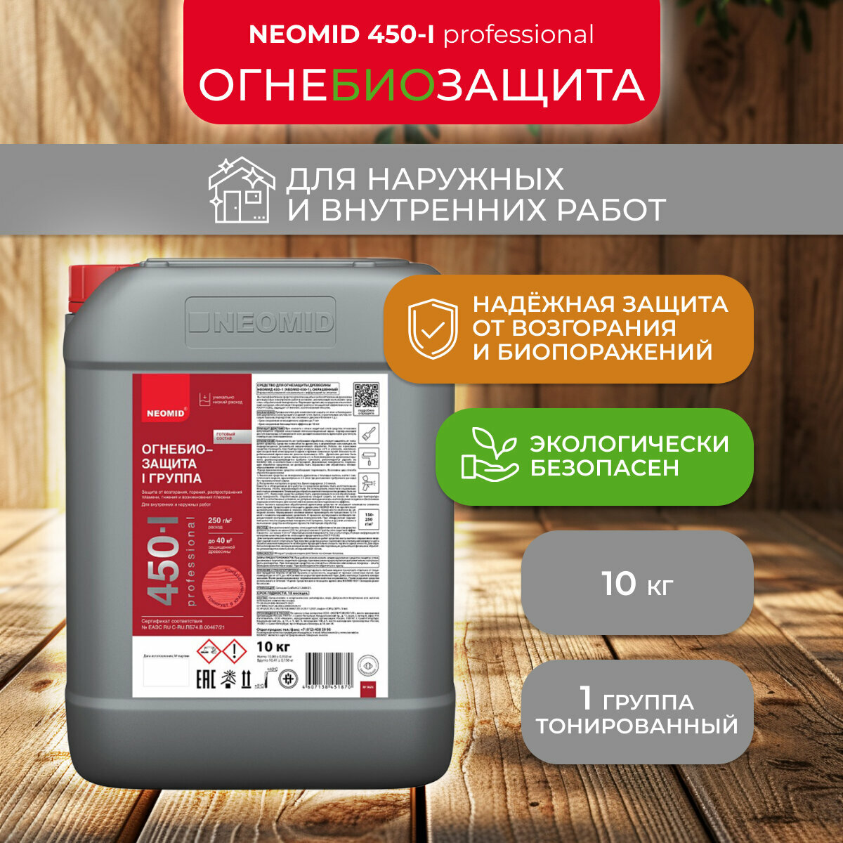 Огнебиозащитный состав для древесины Neomid 450, 1 группа, 10 кг, бесцветный