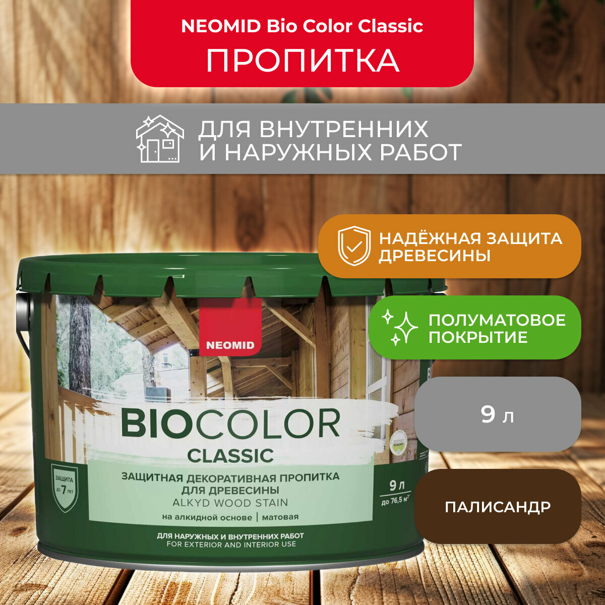 Защитно-декоративная пропитка для дерева Neomid Bio Color Classic, полуматовая, 9 л, палисандр