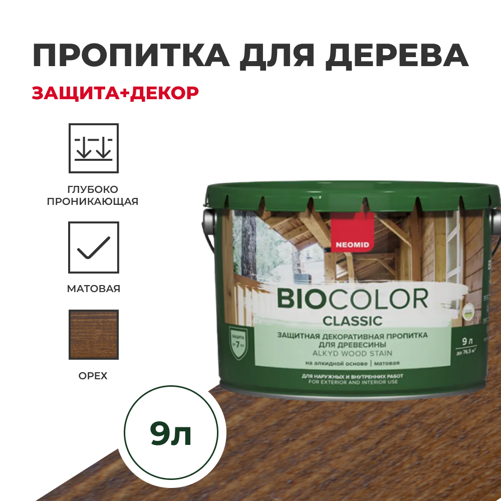 Защитно-декоративная пропитка для дерева Neomid Bio Color Classic, полуматовая, 9 л, орех