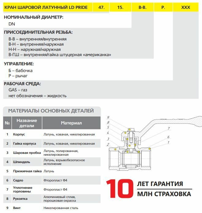 | Дополнительная информация | Шаровой кран LD Pride 47.15. B-Н. Р латунный, внутренняя/наружная резьба, ручка-рычаг, 1/2" LD 47.303.15 |