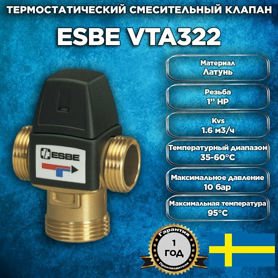 ESBE VTA322 (31101013/31101000) t 35-60 C, 1" нар.р., Kvs 1,6 - Термостатический смесительный клапан трехходовой DN25 для регулировки температуры воды и теплоносителя в системе теплого пола и ГВС
