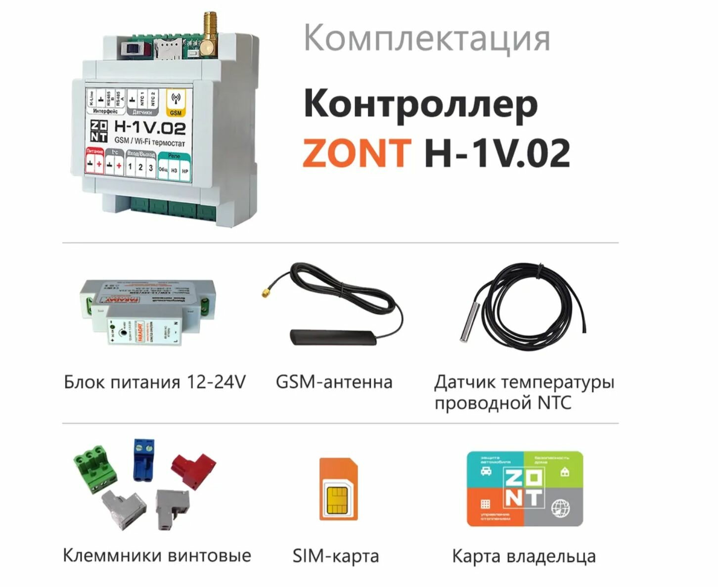 | Подробная комплектация | блок питания 12-24V, GSM - антенна, датчик проводной температуры NTC, клеммники винтовые, Sim-карта, карта владельца |