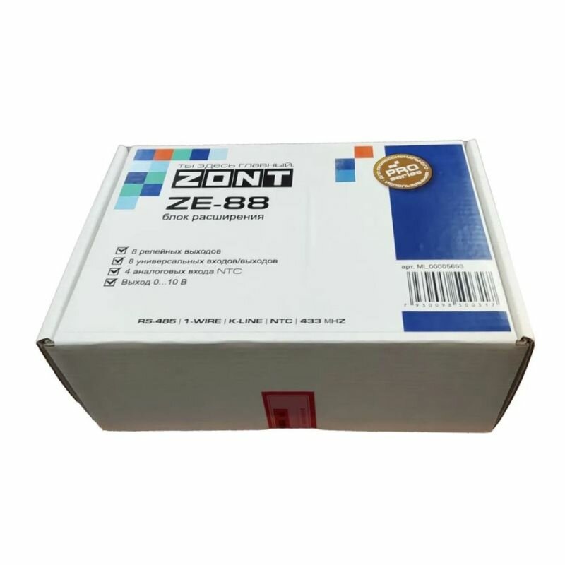 | Подробная комплектация | Блок расширения ZONT ZE-88 1 шт., Набор клеммников 1, Паспорт изделия 1 шт. |