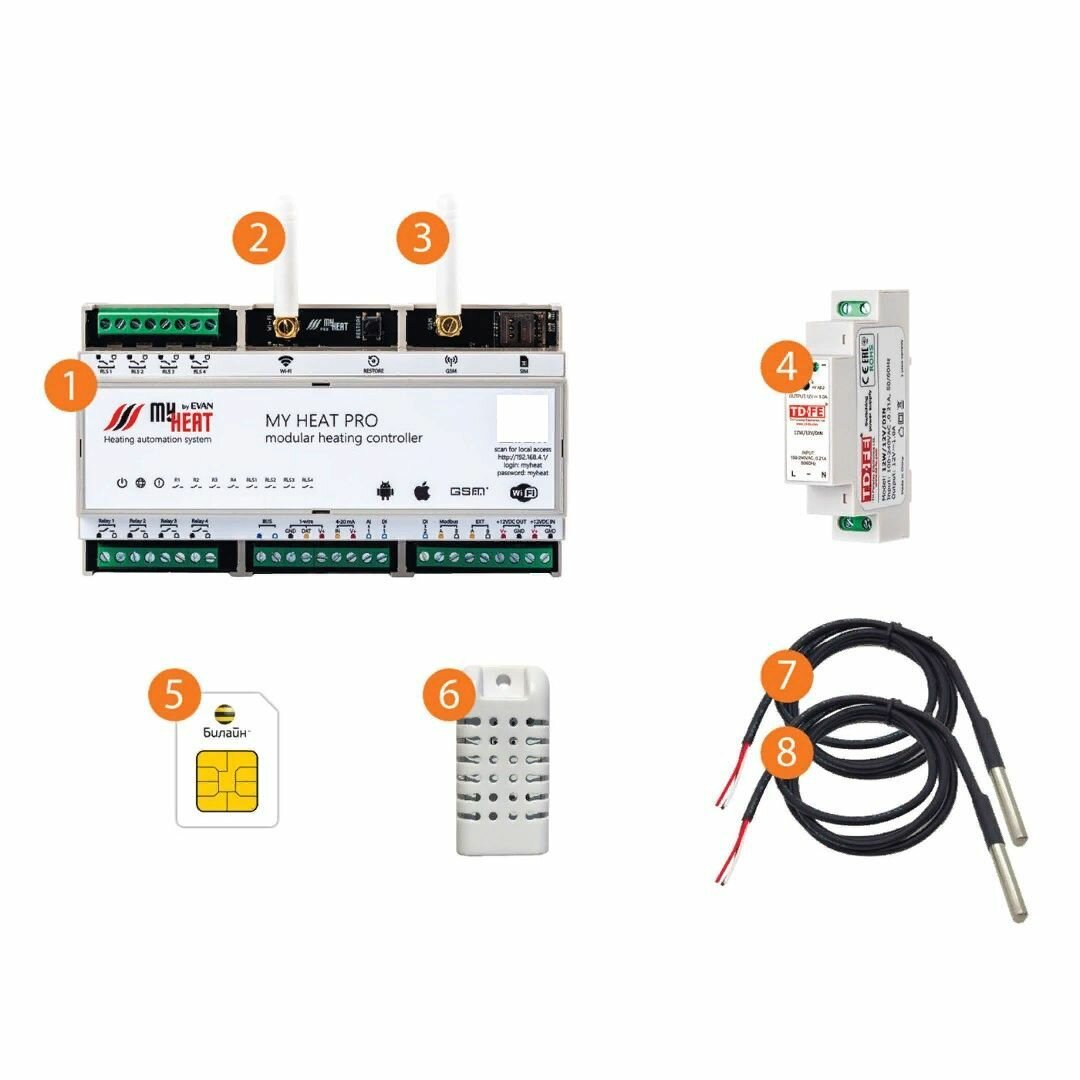 | Подробная комплектация | Контроллер MY HEAT PRO 1 шт. Блок питания 12-24VDC 1 шт. GSM антенна 1 шт. Wi-Fi антенна 1 шт. SIM карта 1 шт. Датчик температуры настенный 1 шт. Датчик температуры в колбе 2 шт. Паспорт технического изделия 1 экз. Гарантийный талон 1 экз. Упаковка индивидуальная 1 шт. |
