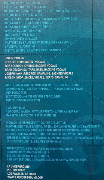 | Треклист | A1. Papercut (3:05) A2. One Step Closer (2:37) A3. With You (3:23) A4. Points Of Authority (3:20) A5. Crawling (3:29) A6. Runaway (3:04) B1. By Myself (3:10) B2. In The End (3:36) B3. A Place For My Head (3:05) B4. Forgotten (3:14) B5. Cure For The Itch (2:37) B6. Pushing Me Away (3:11) |