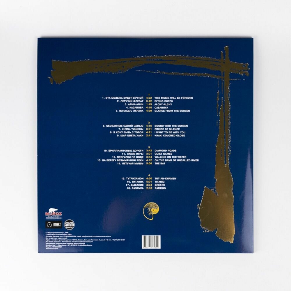 | Треклист | Side 1 : Эта музыка будет вечной - Летучий фрегат - Алчи-Алчи - Казанова - Взгляд с экрана - Side 2 : Скованные одной цепью - Князь тишины - Я хочу быть с тобой - Шар цвета хаки - Side 3 : Бриллиантовые дороги - Тихие игры - Прогулки по воде - На берегу безымянной реки - Side 4 : Тутанхамон - Титаник - Дыхание - Разлука - |