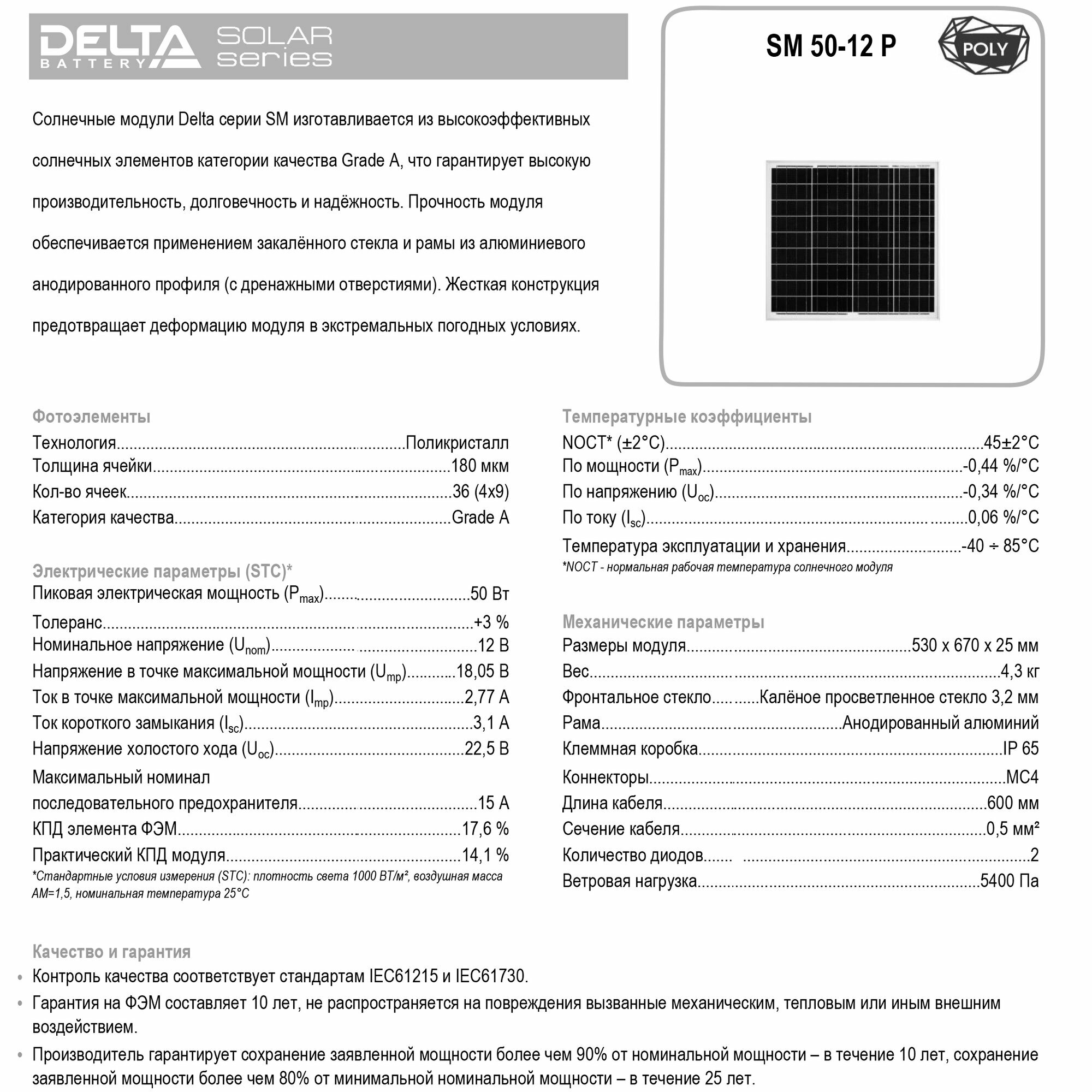 Delta Solar Фотоэлектрический солнечный модуль (ФСМ) 50Ватт 12В Поли Delta SM 50-12 P интересное: