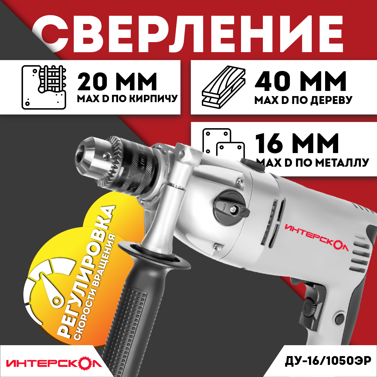 Дрель ударная Интерскол ДУ-16/1050ЭР, 1050 Вт, патрон кулачковый реверс