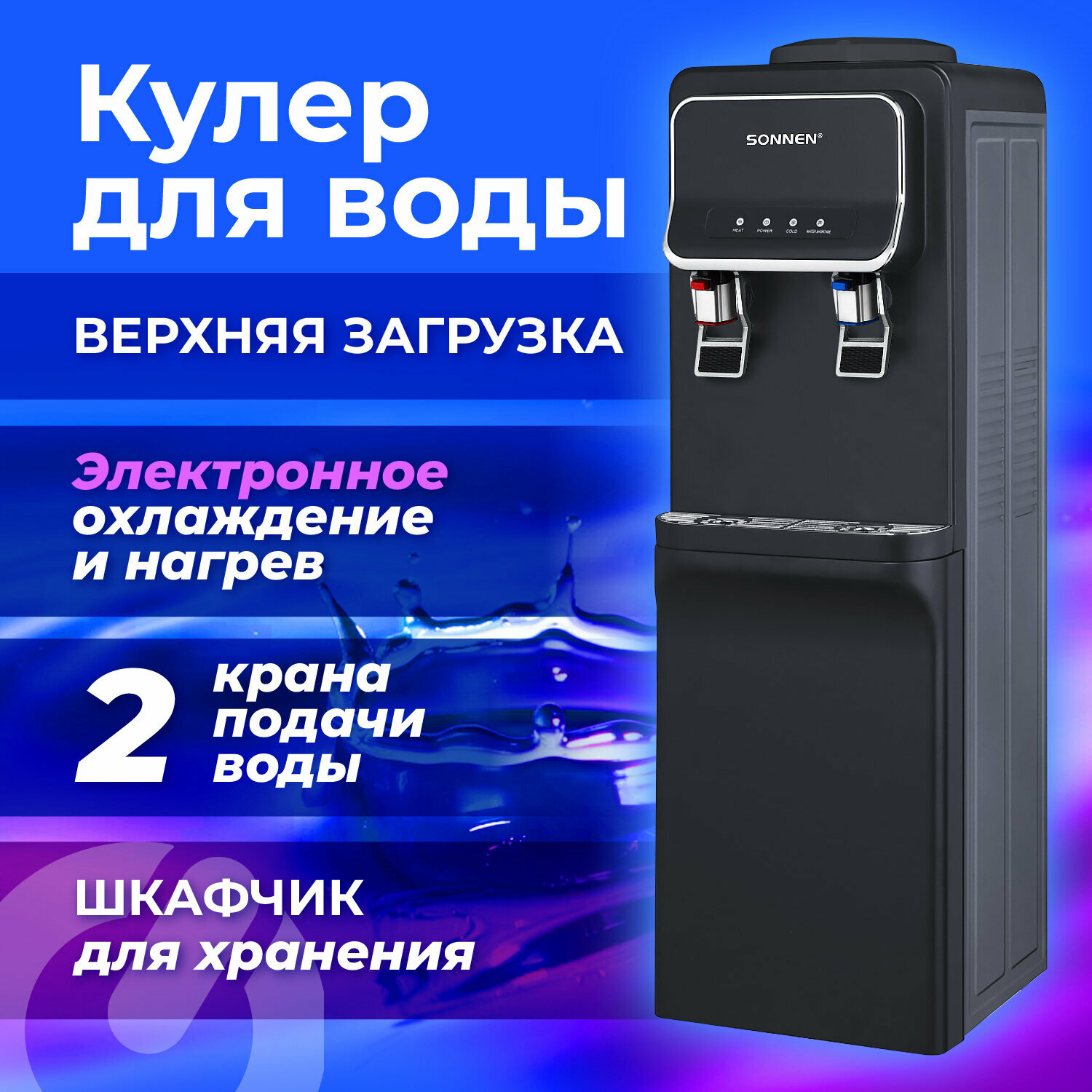 Кулер для воды SONNEN FSE-02Wc, напольный, нагрев/охлаждение электронное, шкаф, 2 крана, белый, 456167, в комплекте 1шт