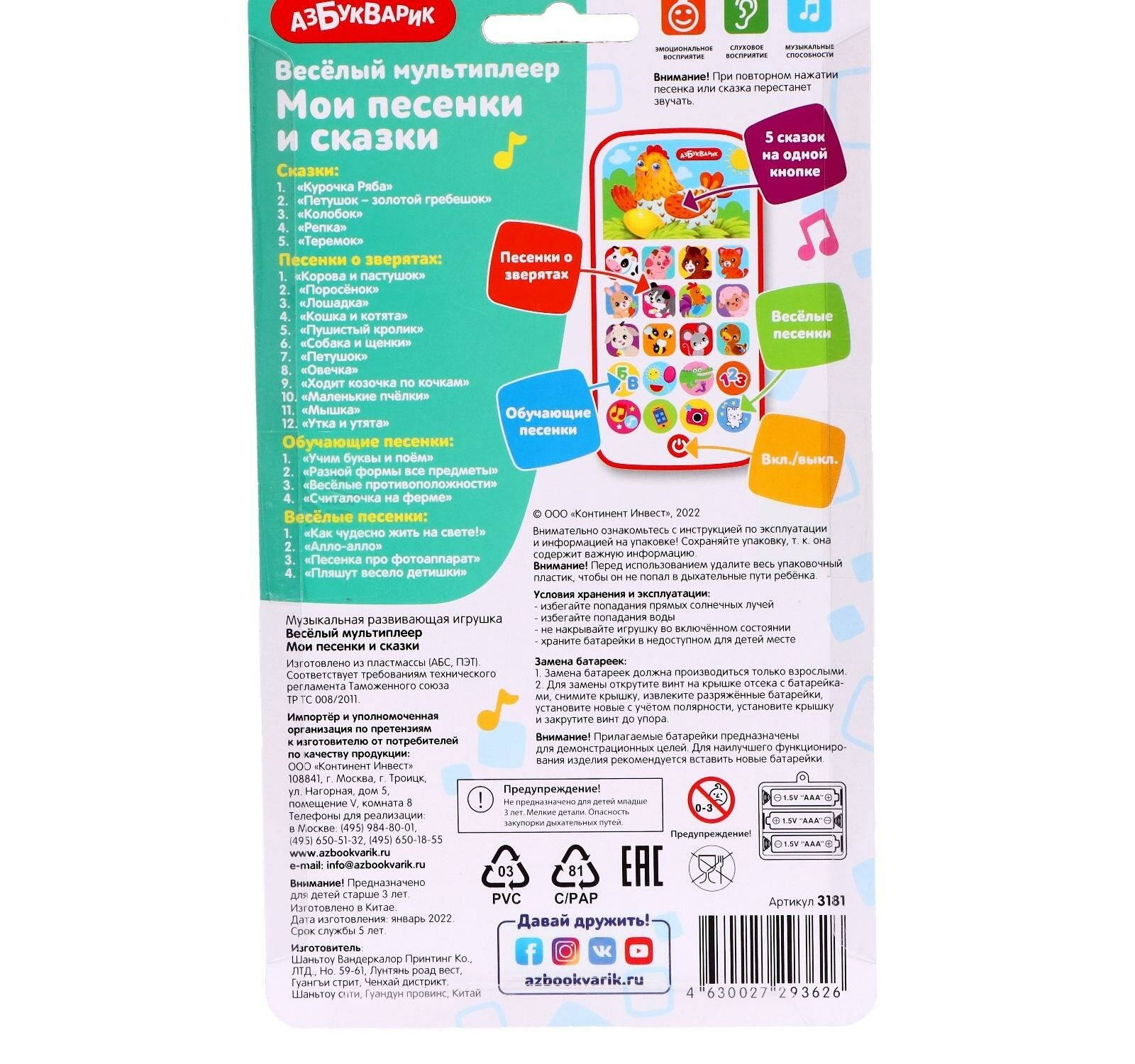 Мультиплеер Азбукварик Мои песенки и сказки, развивающий (3181)