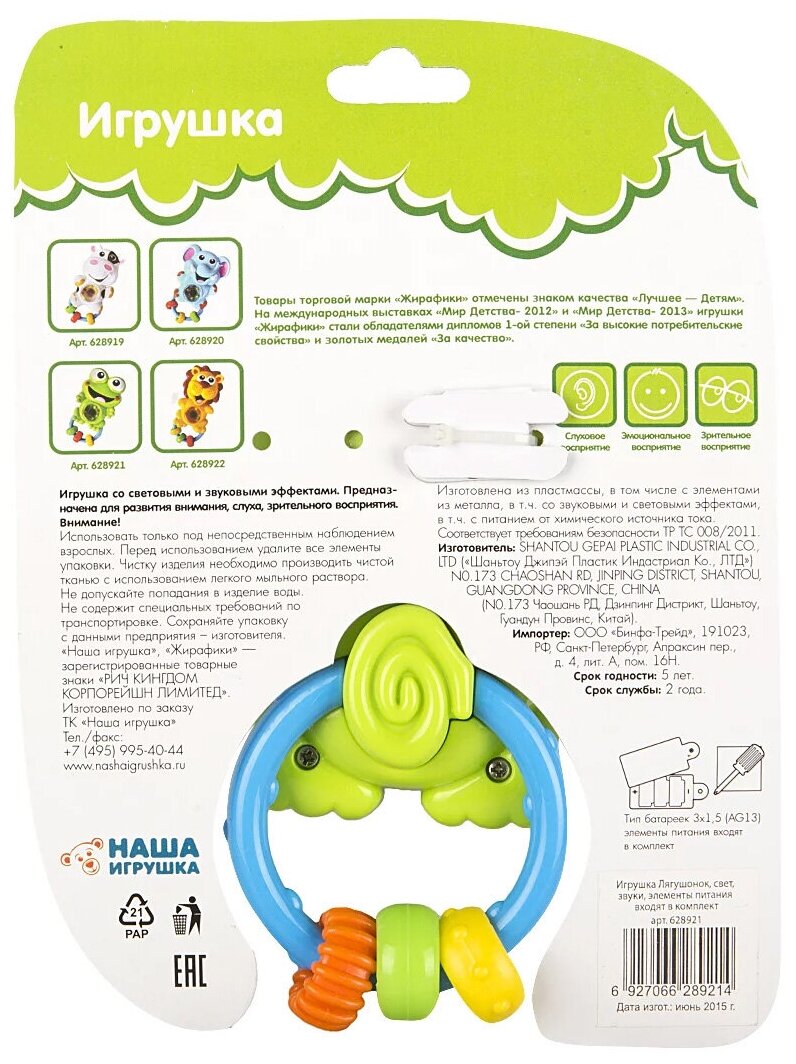 Ниже Вы можете прочитать отзывы на Погремушка для новорожденных со светом, звуком и музыкой Лягушка Жирафики, ознакомится с подробными характеристиками, посмотреть интересные обзоры и фотографии на Погремушка для новорожденных со светом, звуком и музыкой Лягушка Жирафики.