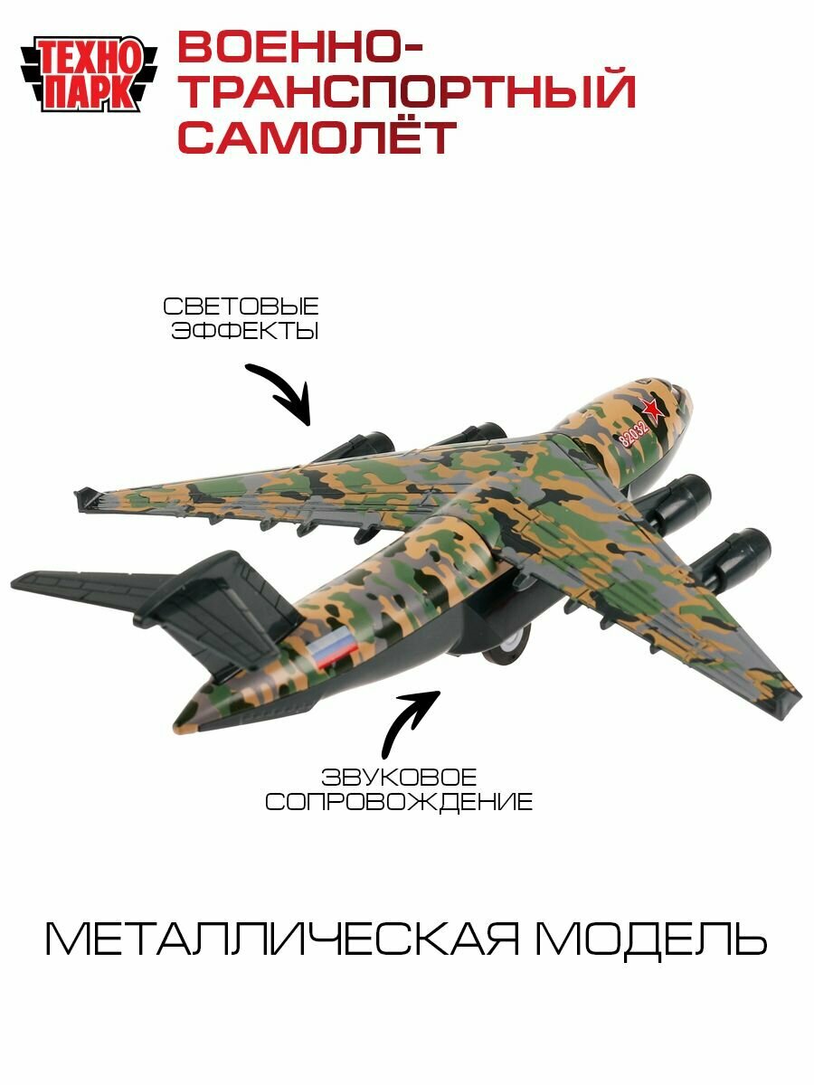 Модель Технопарк Самолет военно-транспортный камуфляж 20см металлический, свет+звук