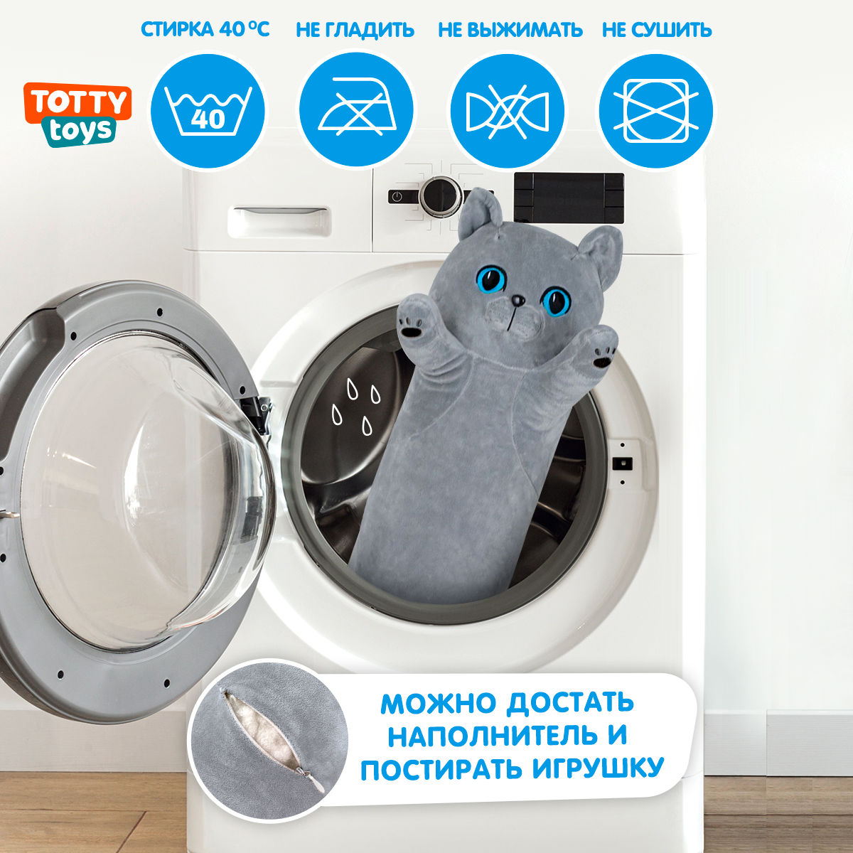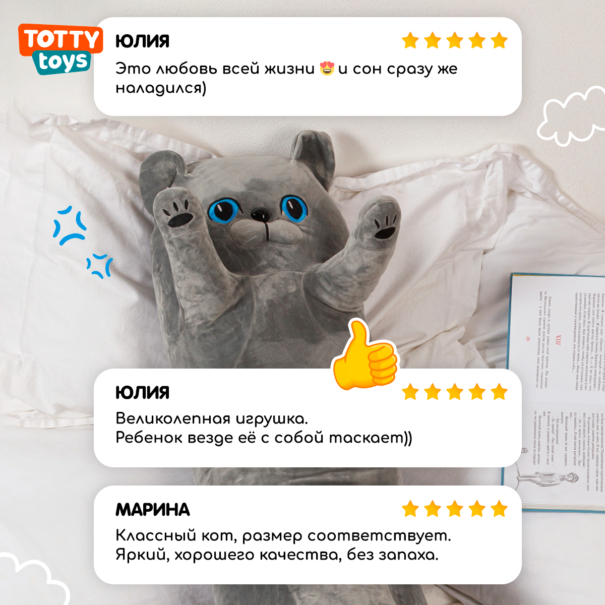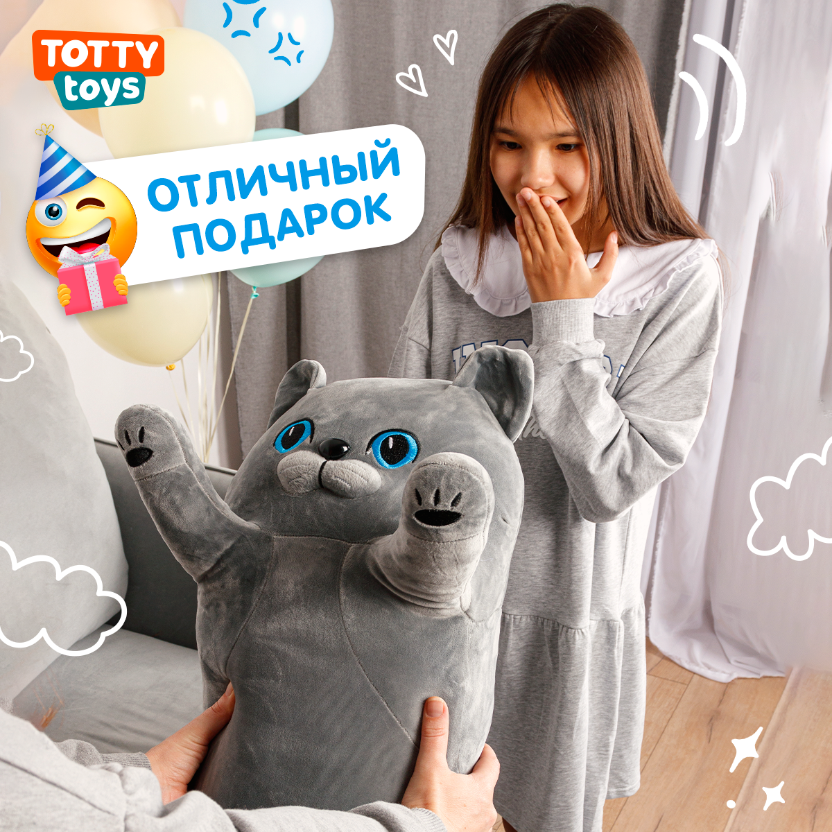 СохранитьМягкая игрушка подушка Totty toys длинный Кот батон 130 см, британец серый с голубыми глазами интересное:
