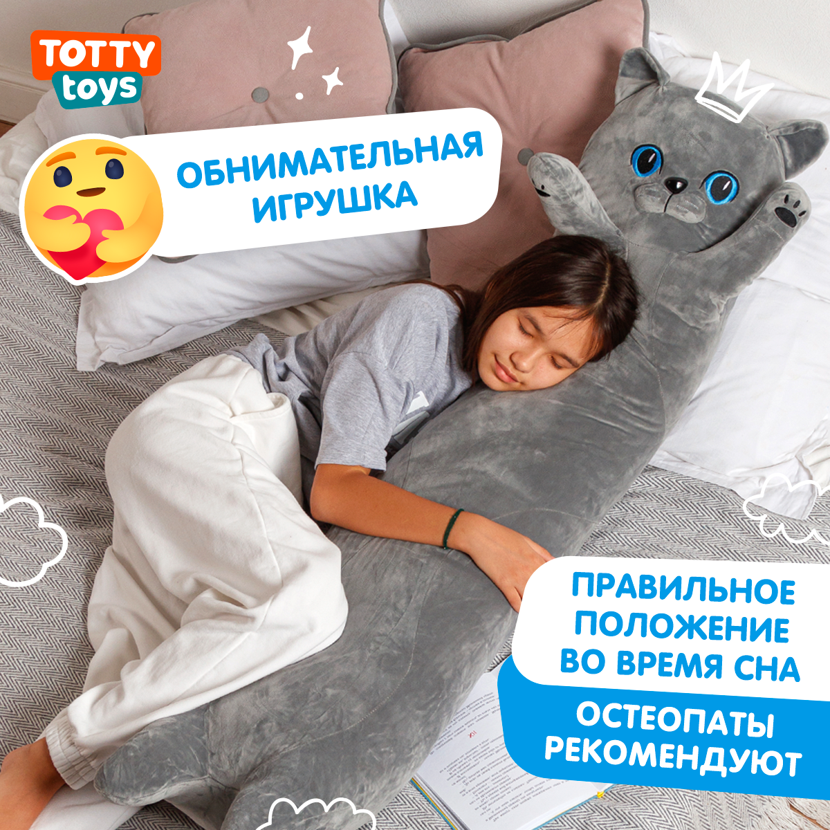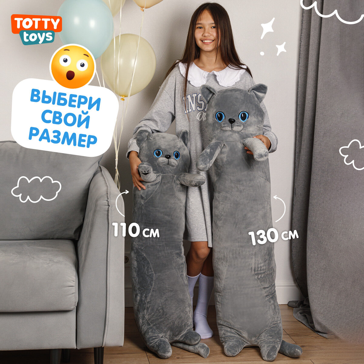 Купить Мягкая игрушка подушка Totty toys длинный Кот батон 130 см, британец серый с голубыми глазами