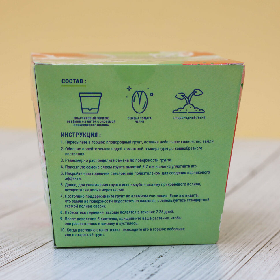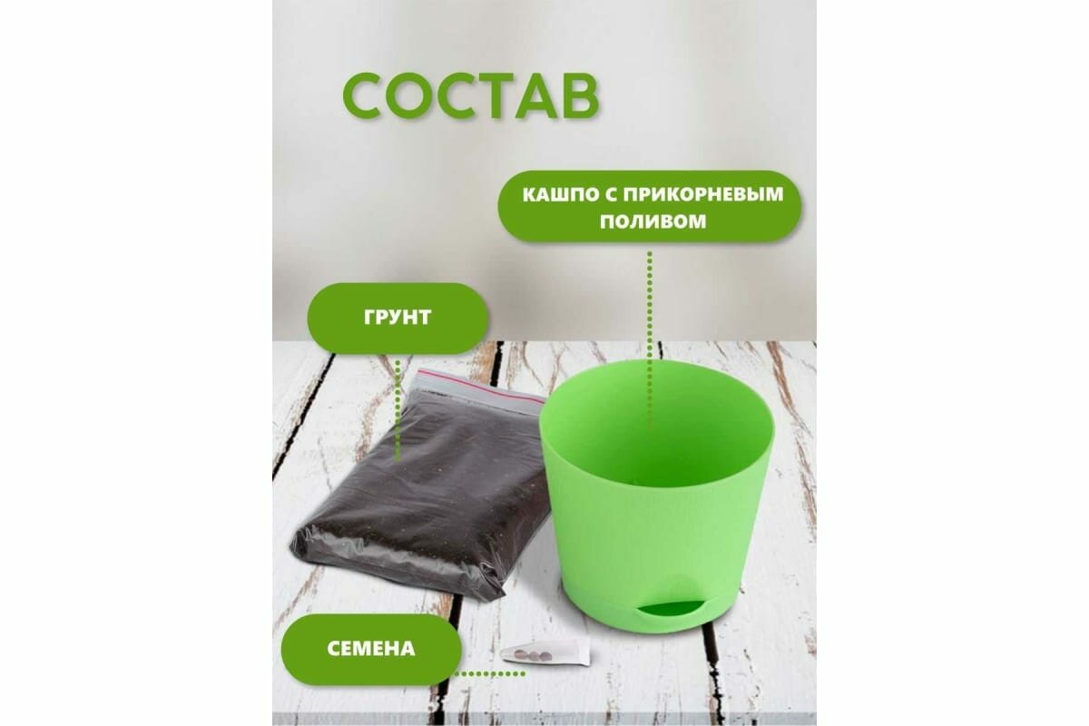 | Комплектация | Пластиковый горшок объёмом 0,4 литра с системой прикорневого полива. Даная система регулирует поступление воды в растение и способствует циркуляции воздуха, что препятствует загниванию корневой системы. Семена. Плодородный грунт. Бирка для маркировки растения и даты посадки, используйте карандаш или маркер. |