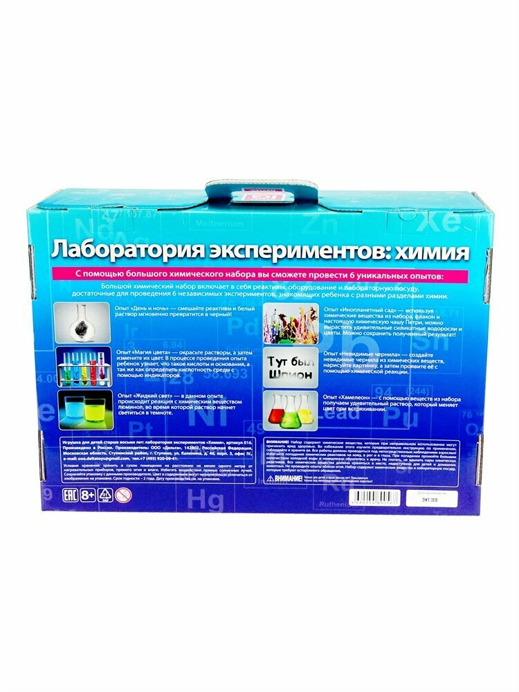 | Комплектация | пластиковый флакон, пробирки, подставка для пробирок, чайные ложки, мерная ложка, пипетки пастера, чашка петри, стеклянный флакон, мерный стаканчик, силикатная основа (раствор силиката натрия), феноловый красный, индигокармин, метиловый оранжевый, столовая ложка, глюкоза, сульфат марганца, сульфат меди, хлорид кальция, гидроперит, крахмал, лимонная кислота, тиосульфат натрия, йодид калия, карбонат натрия, люминол, гексацианоферрат калия, танин, хлорид железа, инструкция, перчатки, стаканы |