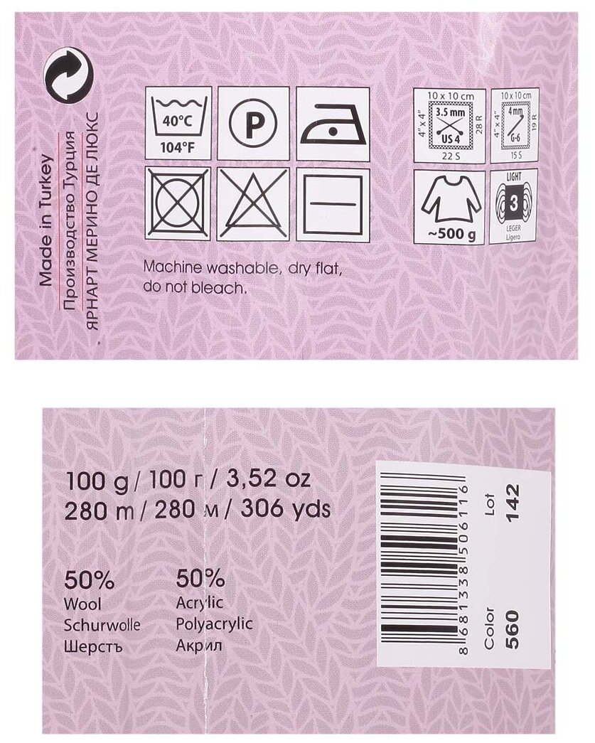 Пряжа MERINO DE LUXE 50 (YarnArt), т. пыл. сирень - 560, 50% шерсть, 50% акрил, 5 мотков, 100 г, 280 м.