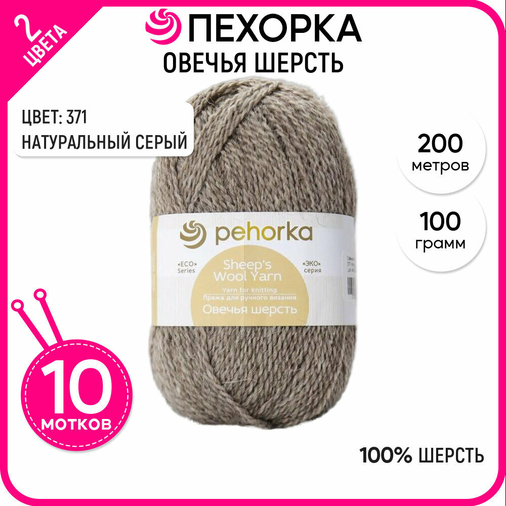 Пряжа Пехорский текстиль "Овечья шерсть", 100%, 200 м, №371, натуральный серый цвет, 10 шт по 100 г