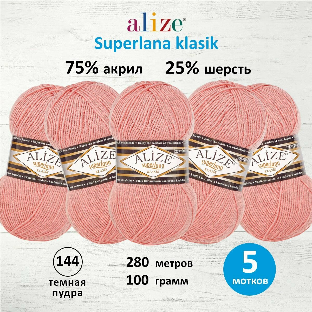 Купить Пряжа Alize Superlana klasik темная пудра (144), 25%шерсть/75%акрил, 280м, 100г, 5шт