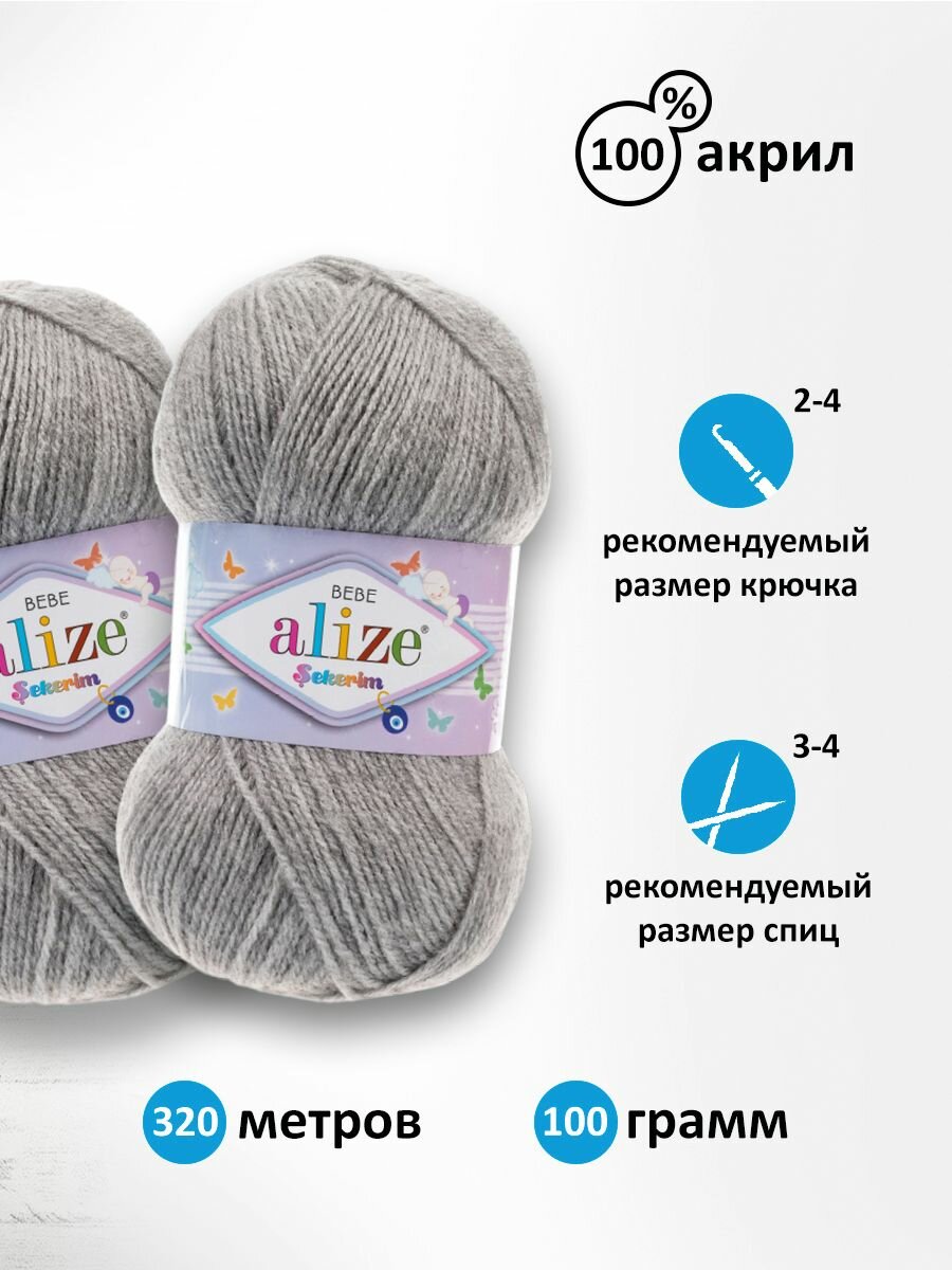 Пряжа для вязания Alize Sekerim Bebe (Шекерим Беби) - 5 мотков 21 серый меланж, детская гипоаллергенная, 100% акрил, 320м/100г