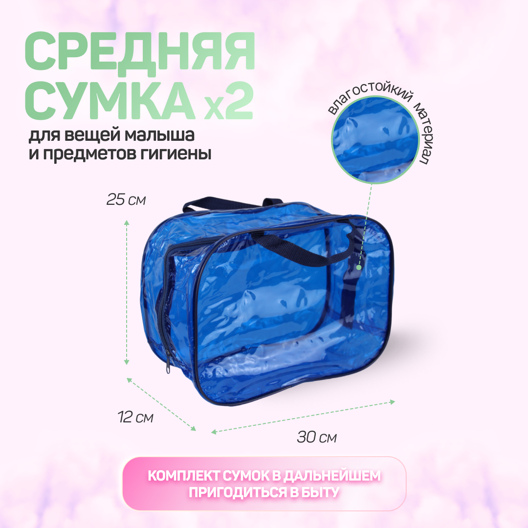 Сумка в роддом готовая для мамы и малыша с наполнением "Комфорт+", 34 предмета, 4 сумки, прозрачная