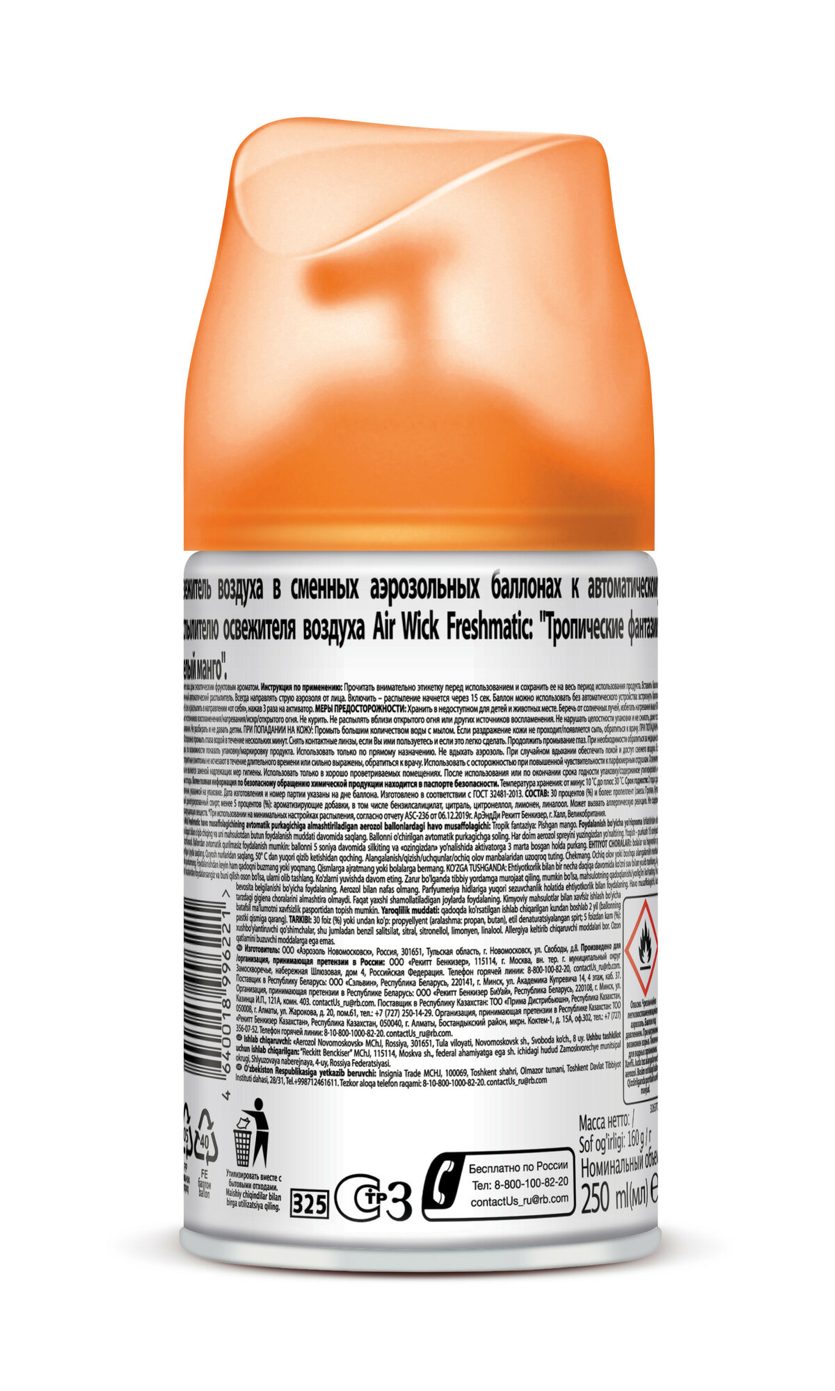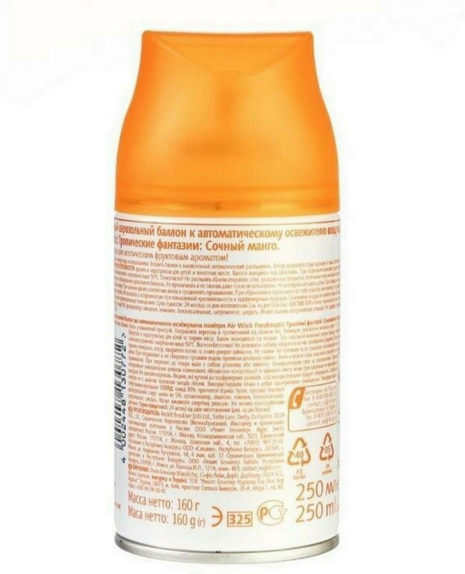 | Дополнительная информация | баллон для автоматического освежителя воздуха Air Wick Freshmatic; перед тем, как вставить аэрозоль, проверьте, что диспенсер выключен; не направляйте в лицо при включении или при установке интервала распыления; после включения распыление начнется автоматически через 15 сек |