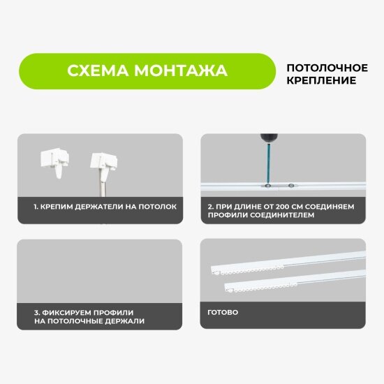 | Комплектация | Направляющая раздвижная - 1 шт, наконечники - 2 шт, держатели - 3 шт, кольца с крючками - 25 шт, шурупы с дюбелями - 6 шт. |