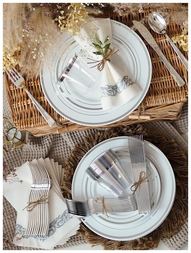 Купить Одноразовая пластиковая посуда для сервировки стола на 12 персон. В наборе 84 предмета: тарелки, ножи, вилки, ложки, стаканы, салфетки. Серебро