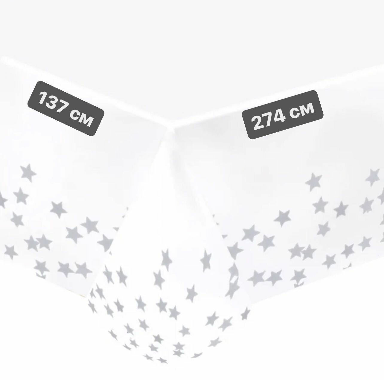 Скатерть праздничная одноразовая полиэтиленовая Riota для праздника Звезды серебристые/серебряные металлик, белая, 137х183 см