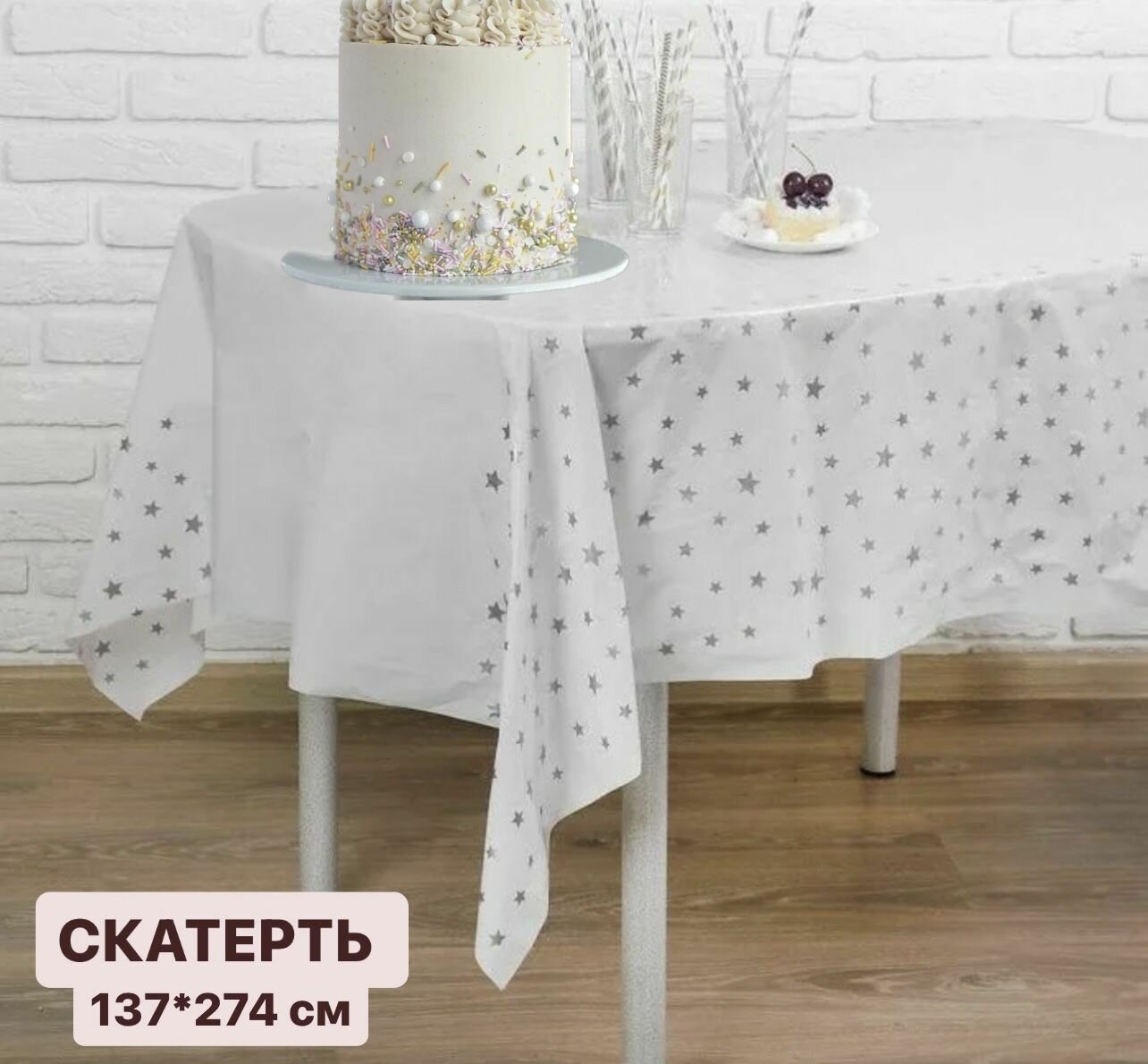 Скатерть праздничная одноразовая полиэтиленовая для праздника Звезды серебристые/серебряные металлик, белая, 137х183 см