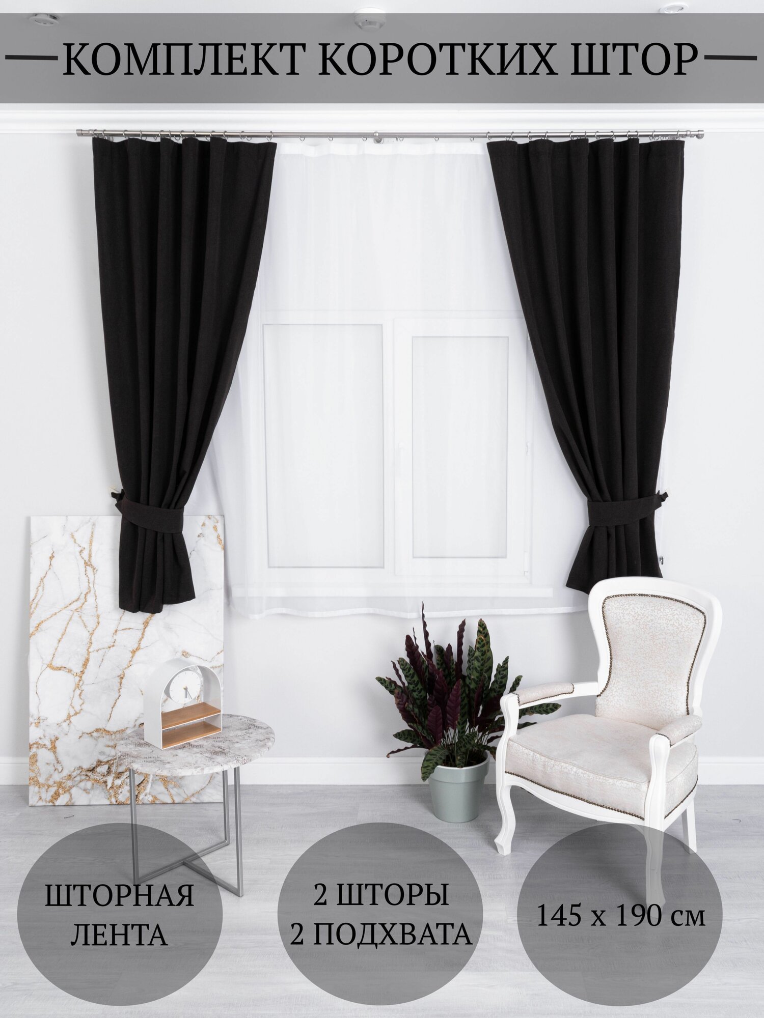 Шторы короткие Worldacces, 145х190 см с подхватом (темно-серые 2 шт)