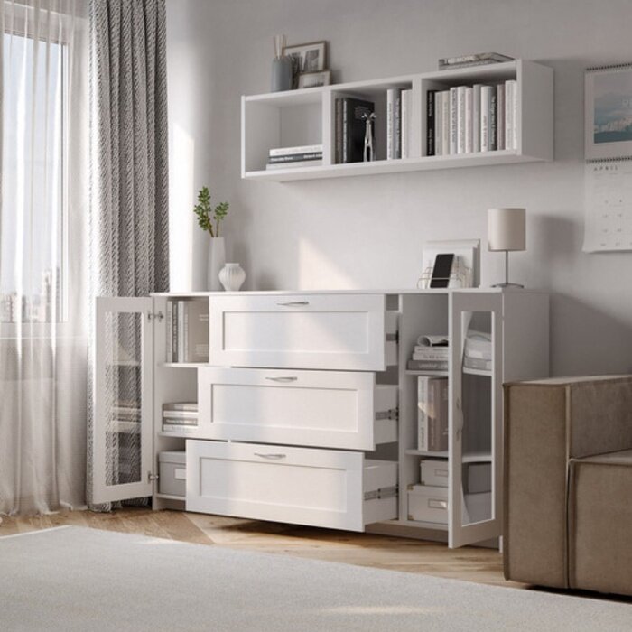 Тумба двухдверная, 156х95 см, с тремя выдвижными ящиками, двери со стеклом, белый