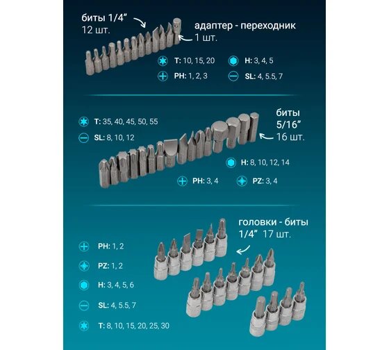 | Шлицы бит | Torx (T/TX) / крестообразный (PH) / крестообразный (PZ) / прямой (SL) / шестигранный (H/HEX) |