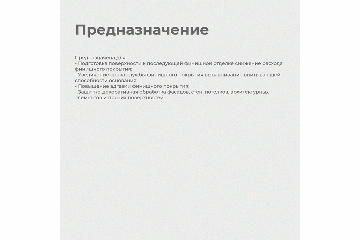 | Дополнительная информация | для подготовки поверхности к последующей финишной отделке, защитно-декоративная обработки поверхностей |