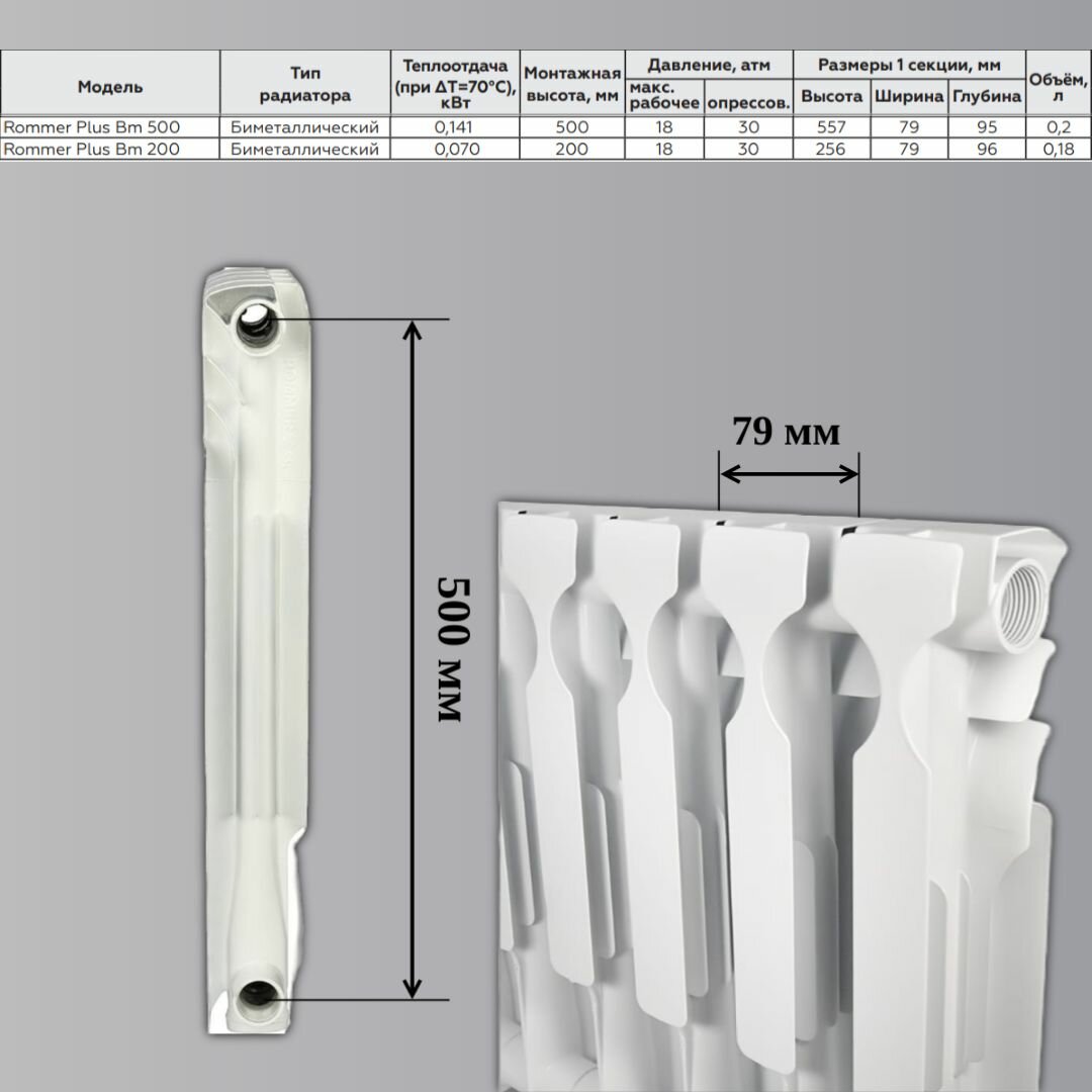 Радиатор секционный биметаллический Plus BM 500 8 секций параметры 557х632х95 боковое подключение Сантехническая нить 20 м